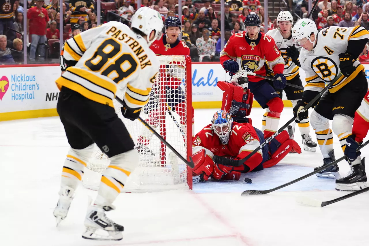Florida Panthers goaltender Sergei Bobrovsky makes a save against the Boston Bruins' David Pastrnak during the third period at Amerant Bank Arena on Thursday, April 2, 2026, in Sunrise, Florida.