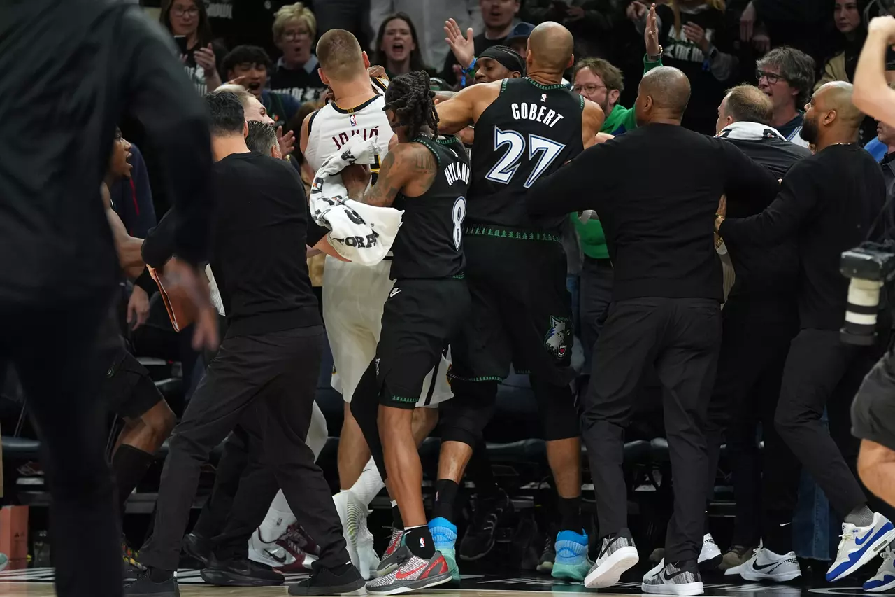 Minnesota Timberwolves and Denver Nuggets players get into an altercation during the second half of Game 4 of a first-round NBA basketball playoff series, Saturday, April 25, 2026, in Minneapolis. (AP Photo/Abbie Parr)