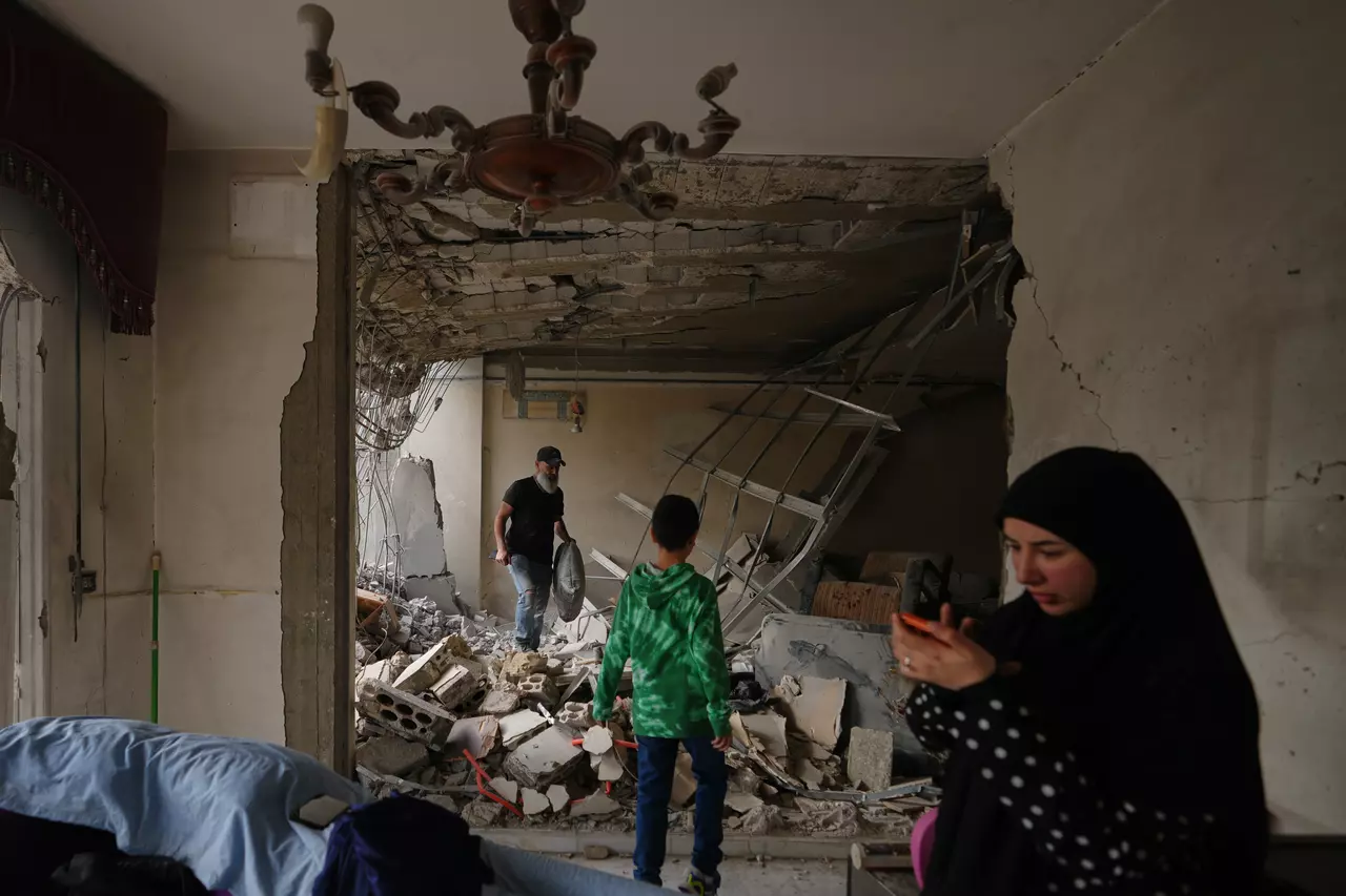 Fadi Al Zein, left, who lost both his homes in Israeli strikes in his village of Khiam and in Dahiyeh, searches through the rubble of his heavily damaged home as a child stands nearby, in Beirut's southern suburbs, Lebanon, Saturday, April 25, 2026. (AP Photo/Hassan Ammar)
