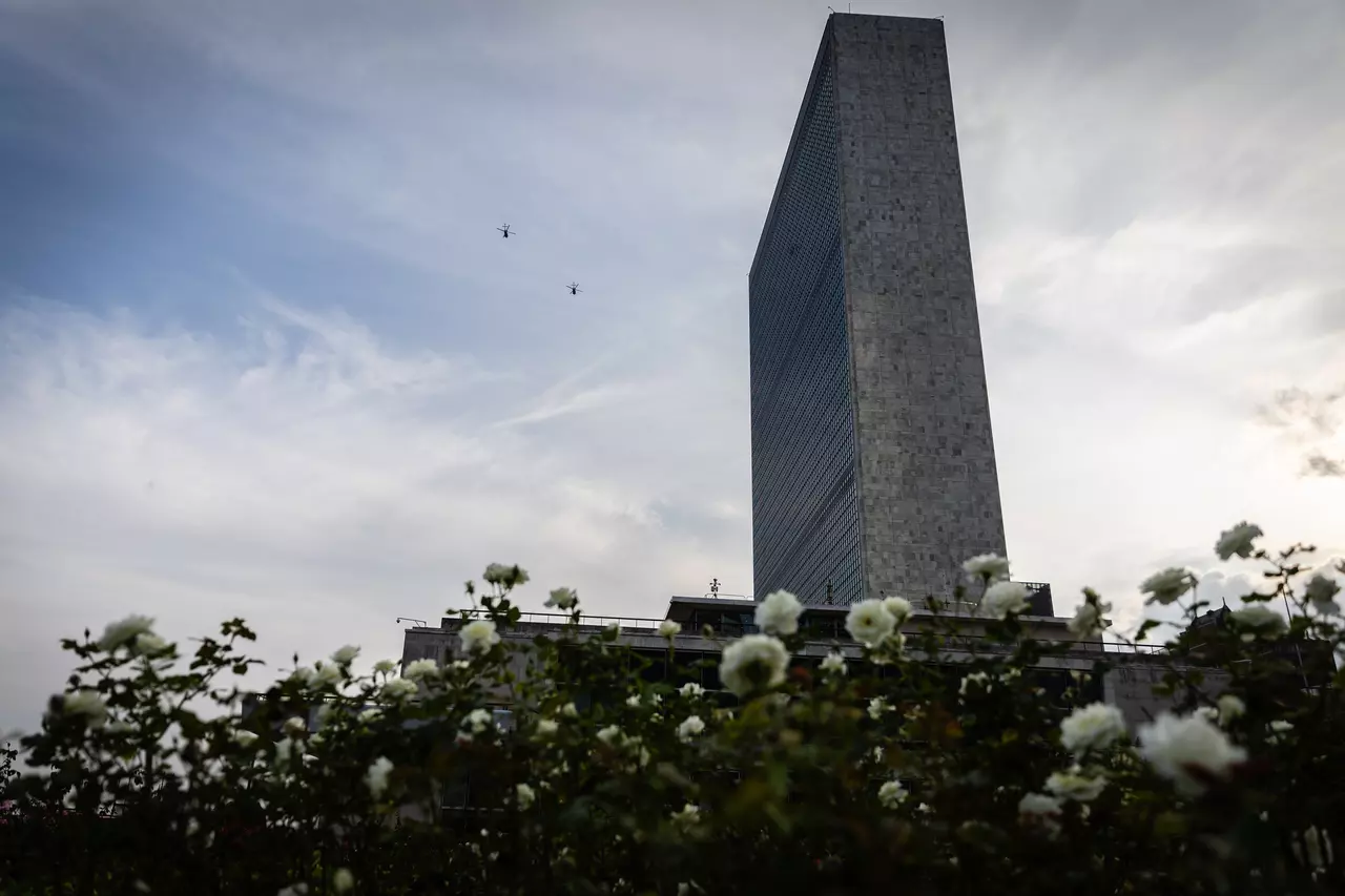 FILE - Military helicopters fly past the United Nations Headquarters building as seen from the rose garden, Sept. 23, 2025. (AP Photo/Stefan Jeremiah, file)