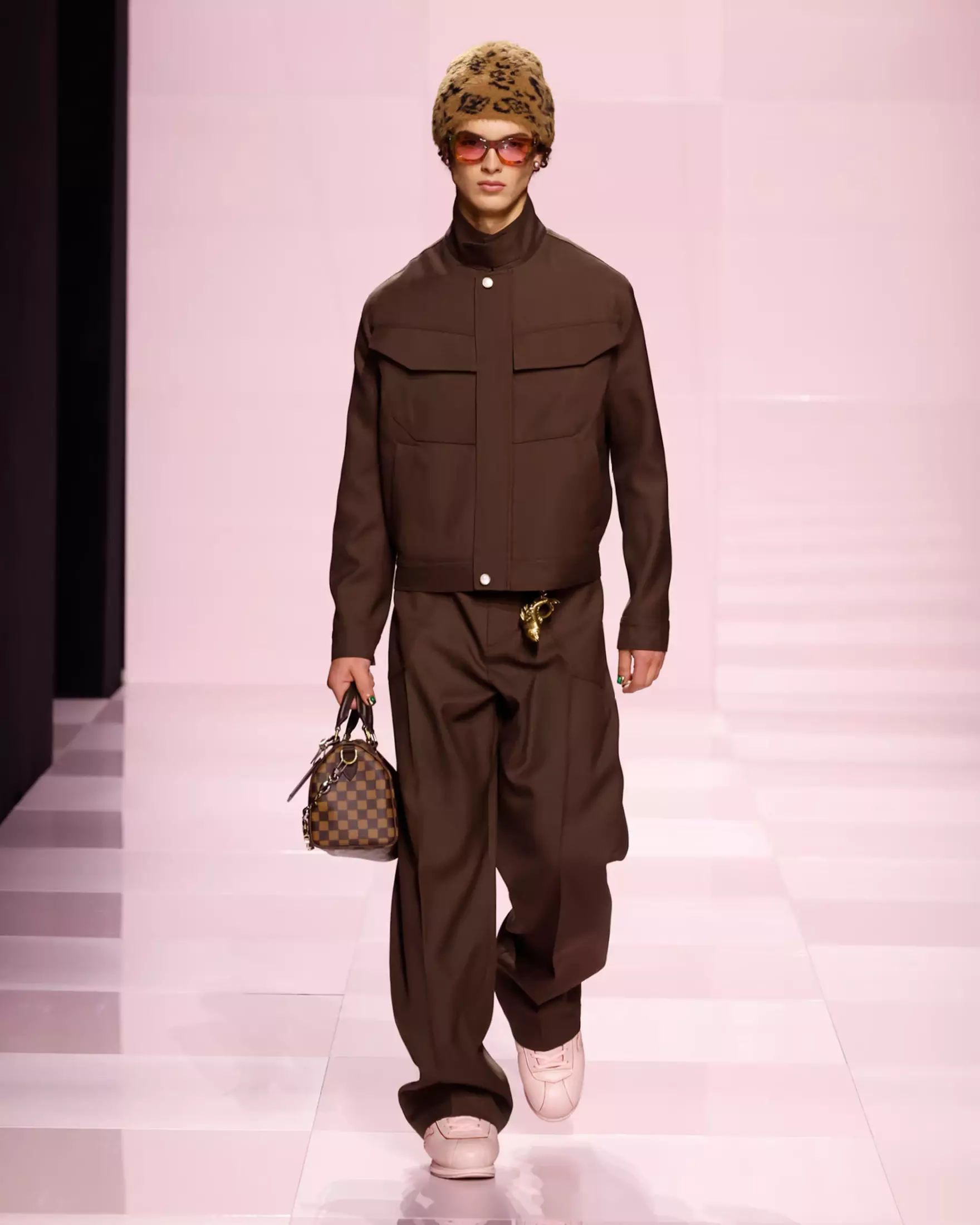 This collection honors Nigo's vast archives of 20th-century workwear, turning utilitarian pieces into luxury items. The rich brown look references a workman’s outfit, upgraded with luxurious fabrics and accessories like a beanie. This piece blends the feel of a uniform with high fashion, making it both practical and aspirational.