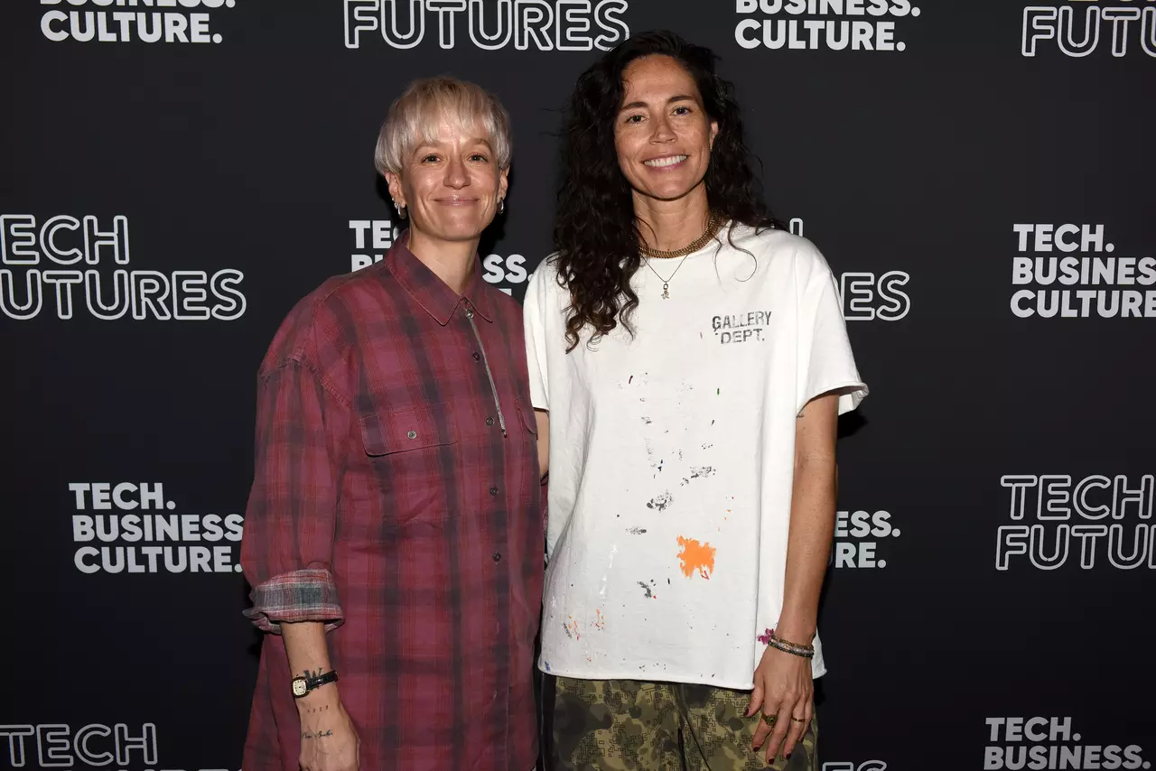Megan Rapinoe, left, and Sue Bird attend the New York# LWTSUMMIT at The Rooftop at Pier 17 on Oct. 7, 2025, in New York.