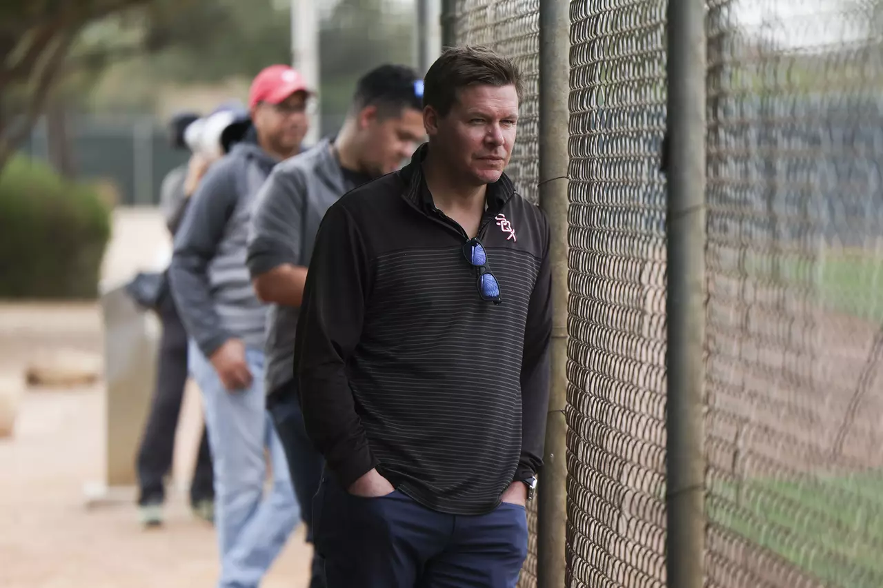 White Sox general manager Chris Getz watches batting practice during spring training at Camelback Ranch on Feb. 16, 2026, in Glendale, Arizona.