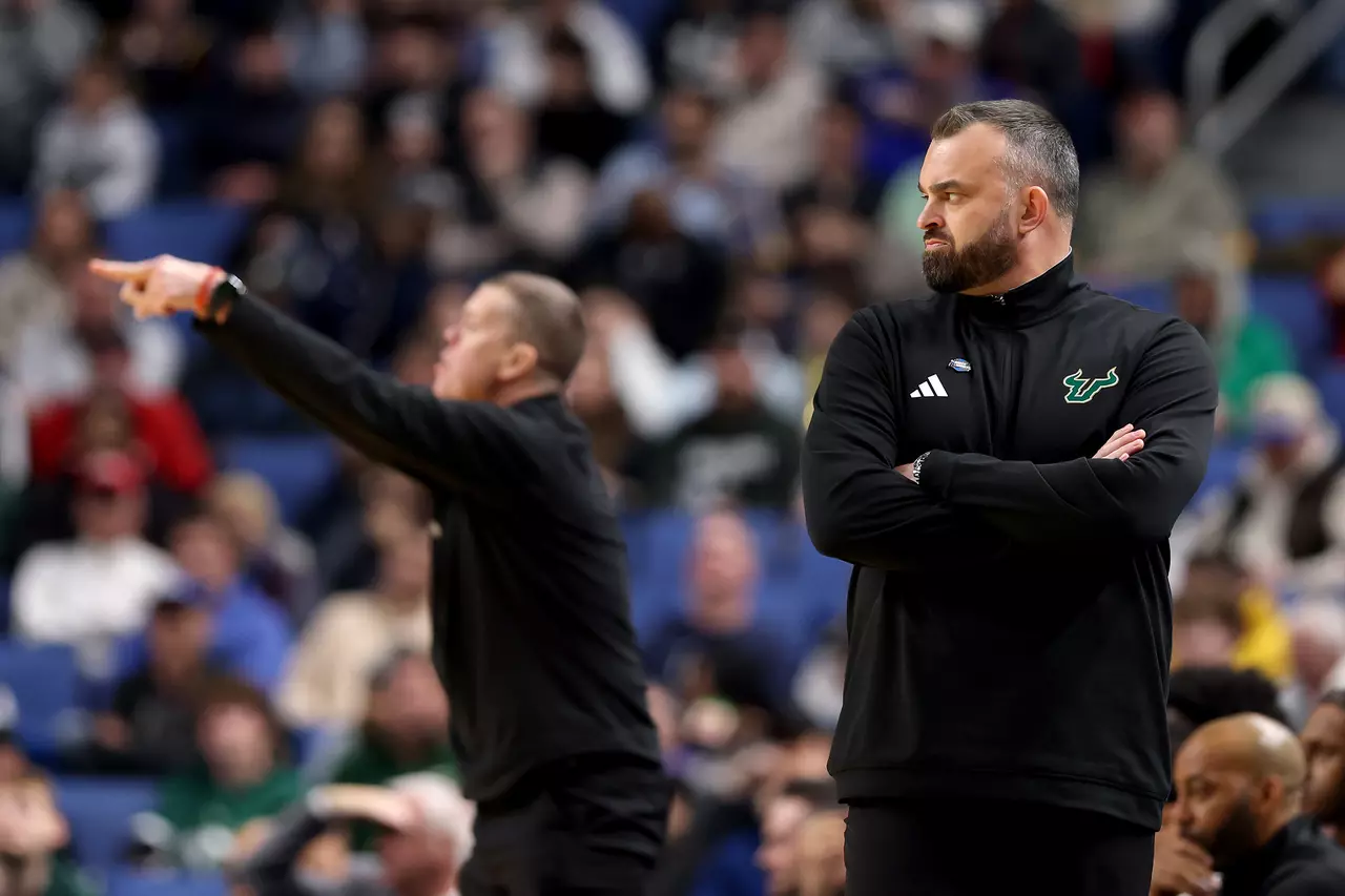 South Florida head coach Bryan Hodgson looks on against Louisville during the second half in the first round of the NCAA Tournament at KeyBank Center on Thursday, March 19, 2026, in Buffalo, New York.