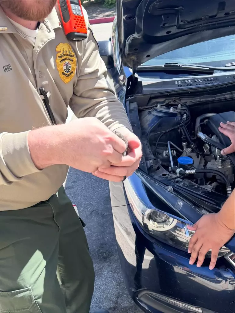 The County of Los Angeles Palmdale Animal Care Center said on social media that a local resident visited recently to report meowing coming from under the hood of their car.