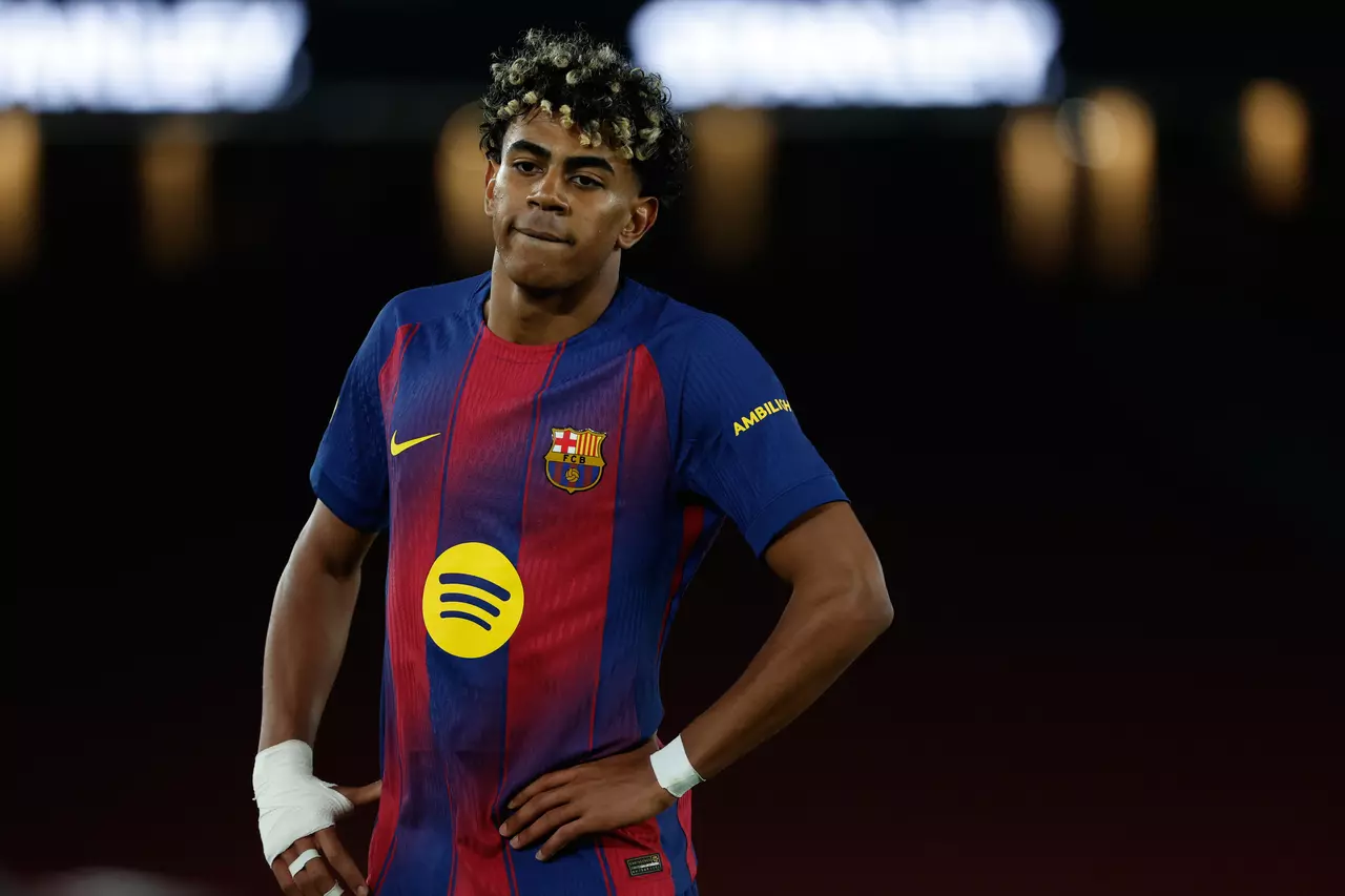 Barcelona's Lamine Yamal reacts during the Copa del Rey semifinal second leg soccer match between Barcelona and Atletico Madrid in Barcelona, Spain, Tuesday, March 3, 2026. (AP Photo/Joan Monfort)