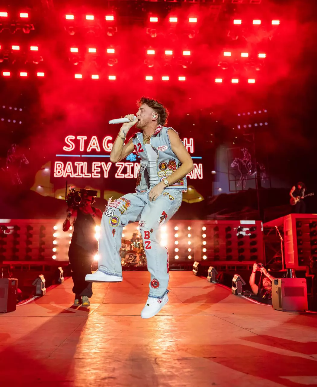 INDIO, Calif. — Bailey Zimmerman performed Friday night at Stagecoach, where his set mixed post-grunge country hits like "Religiously" and "Where It Ends" with a cover of Miley Cyrus' "The Climb" and an appearance by BigXthaPlug on their duet "All the Way." Before Zimmerman's set, I met with the 26-year-old singer inside a denim-bedecked pop-up presented by American Eagle, for whom Zimmerman serves as an official spokesbro.