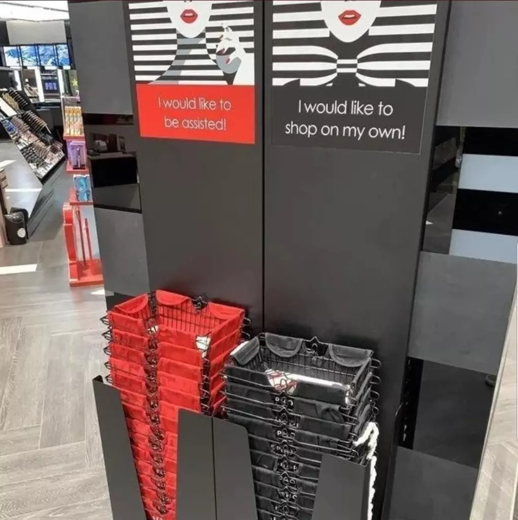 Not everyone enjoys talking to people and even more people don't like the pressure of a salesperson asking them if they need help. These handy color-coded shopping baskets solves this problem for you.