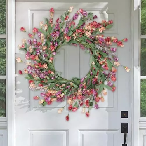 Buy from AmazonThis spring wreath offers a slightly different style, with a semi-circle of colorful peony, rose, lavender and hydrangea flowers curving gracefully around a "hello" sign that greets visitors warmly. The stunning, lush design will complement farmhouse, cottage, and modern home styles.