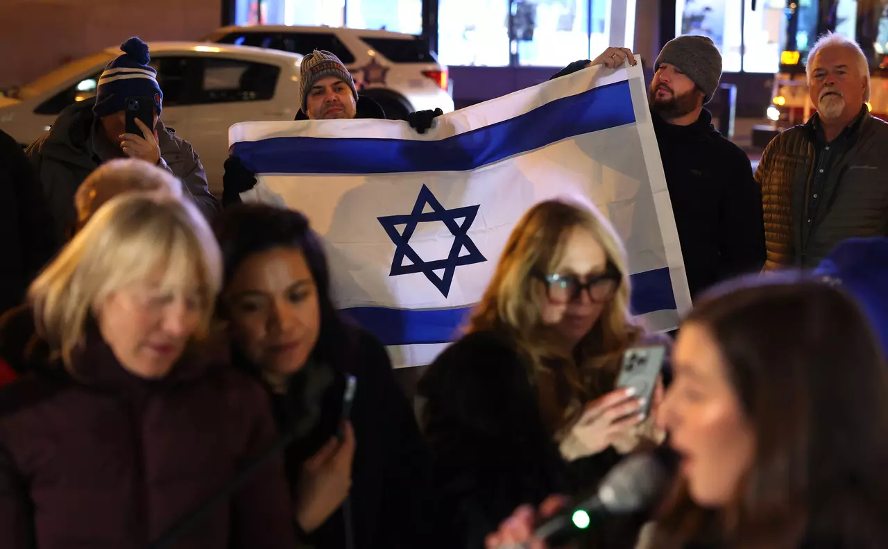 Two men hold an Israeli flag while attending a menorah lighting ceremony hosted by the Chabad Center for Jewish Life of the Loop and Gold Coast on Dec. 16, 2025, at Chicago’ s Daley Plaza.