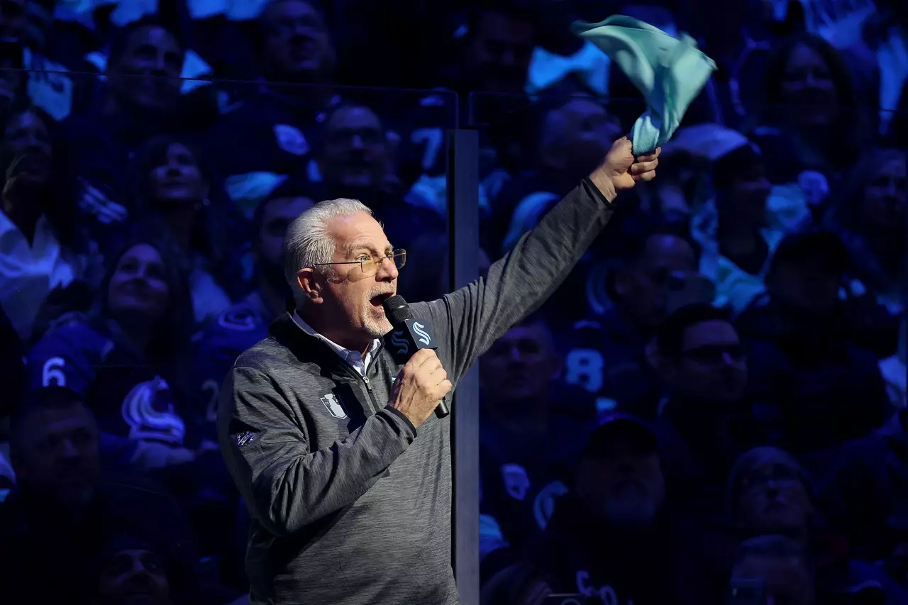 CEO Tod Leiweke of the Seattle Kraken pumps up the crowd before Game 3 of the first round of the 2023 Stanley Cup Playoffs against the Colorado Avalanche at Climate Pledge Arena on April 22, 2023, in Seattle.