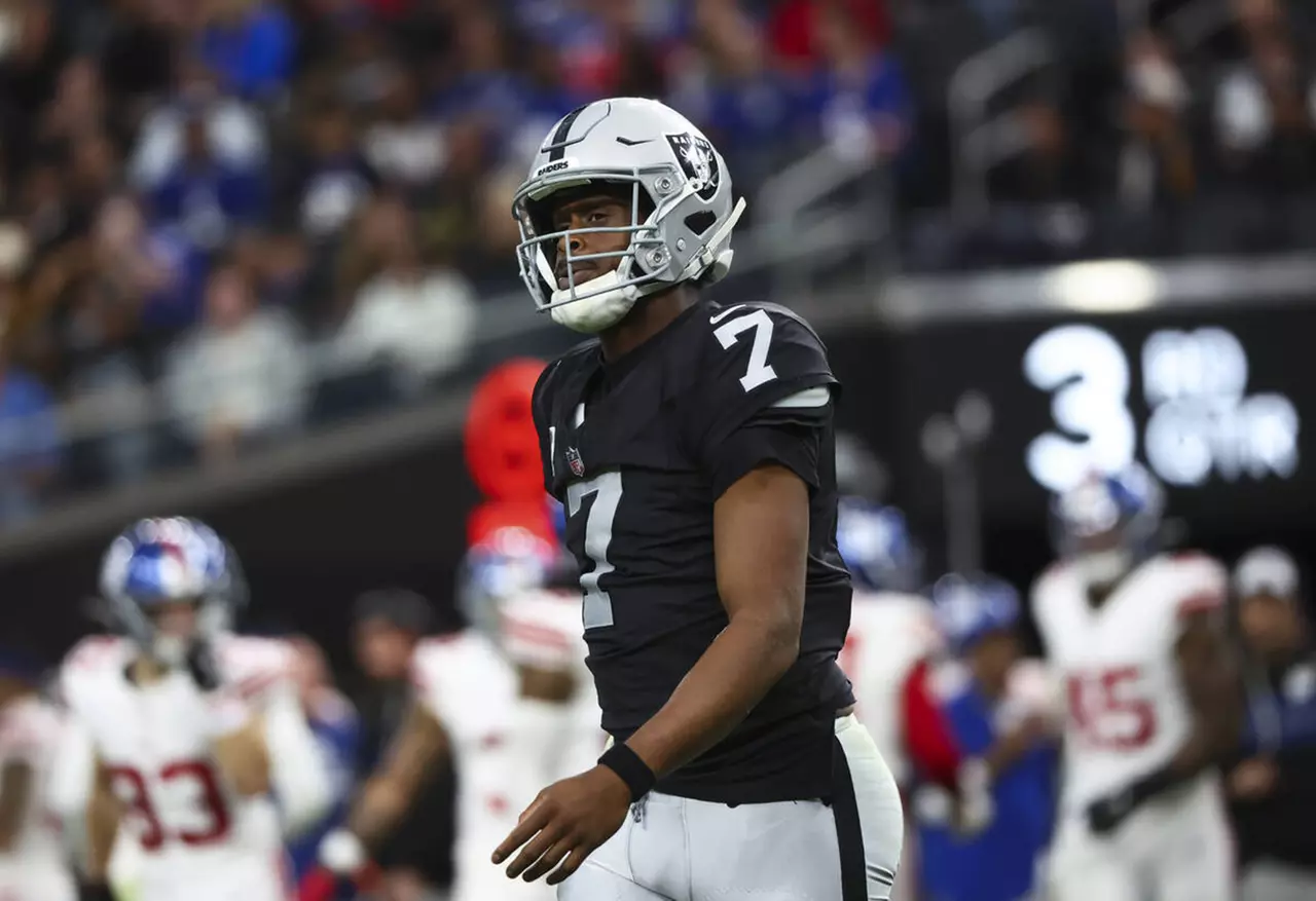 Las Vegas Raiders quarterback Geno Smith looks on after getting sacked by the New York Giants during the second half of an NFL game at Allegiant Stadium on Sunday, Dec. 28, 2025, in Las Vegas.