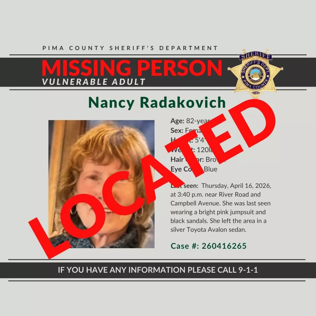 The Pima County Sheriff’ s Department shared a post on on X late Thursday:“ Update: Nancy has been located,” along with the word“ LOCATED” stamped over the missing person’ s poster for Nancy Radakovich, which identified the 82- year-old as a vulnerable adult.