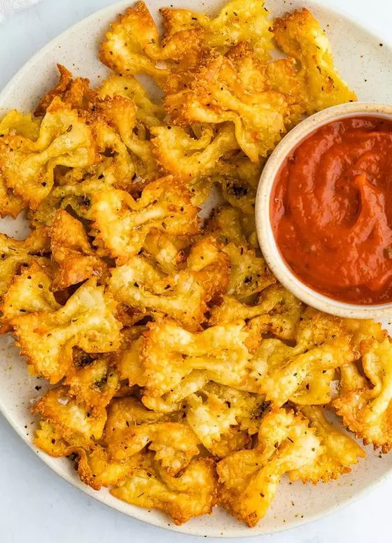 This viral snack is truly delicious! Cook bowtie pasta until done. Drain pasta and toss in a large bowl with Parmesan cheese, Italian seasoning, and garlic powder. Place batches of the seasoned pasta in the basket of an air fryer and cook at 400 for 8-10 minutes. Serve with warm marinara.