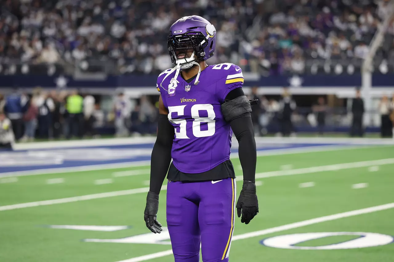 Jonathan Greenard of the Minnesota Vikings participates in warmups prior to a game against the Dallas Cowboys at AT&T Stadium on Dec. 14, 2025, in Arlington, Texas.
