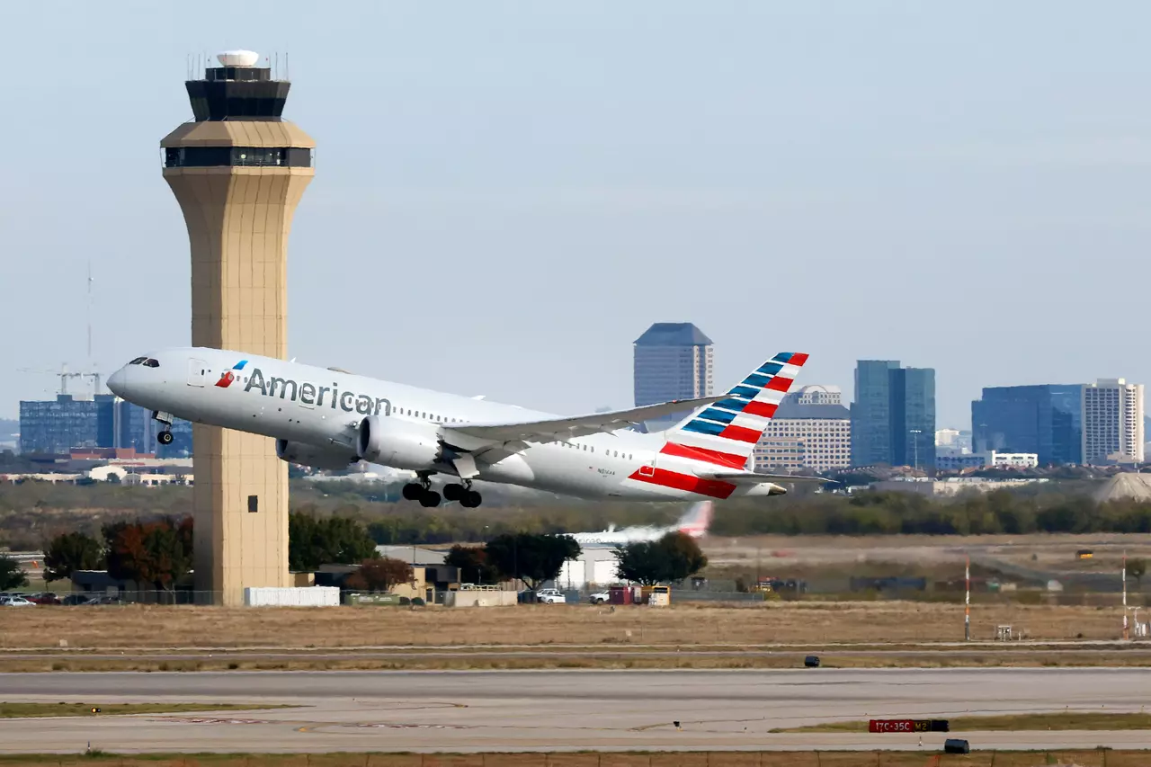An American Airlines jet takes off past the control tower at DFW Airport on Nov. 27, 2023.