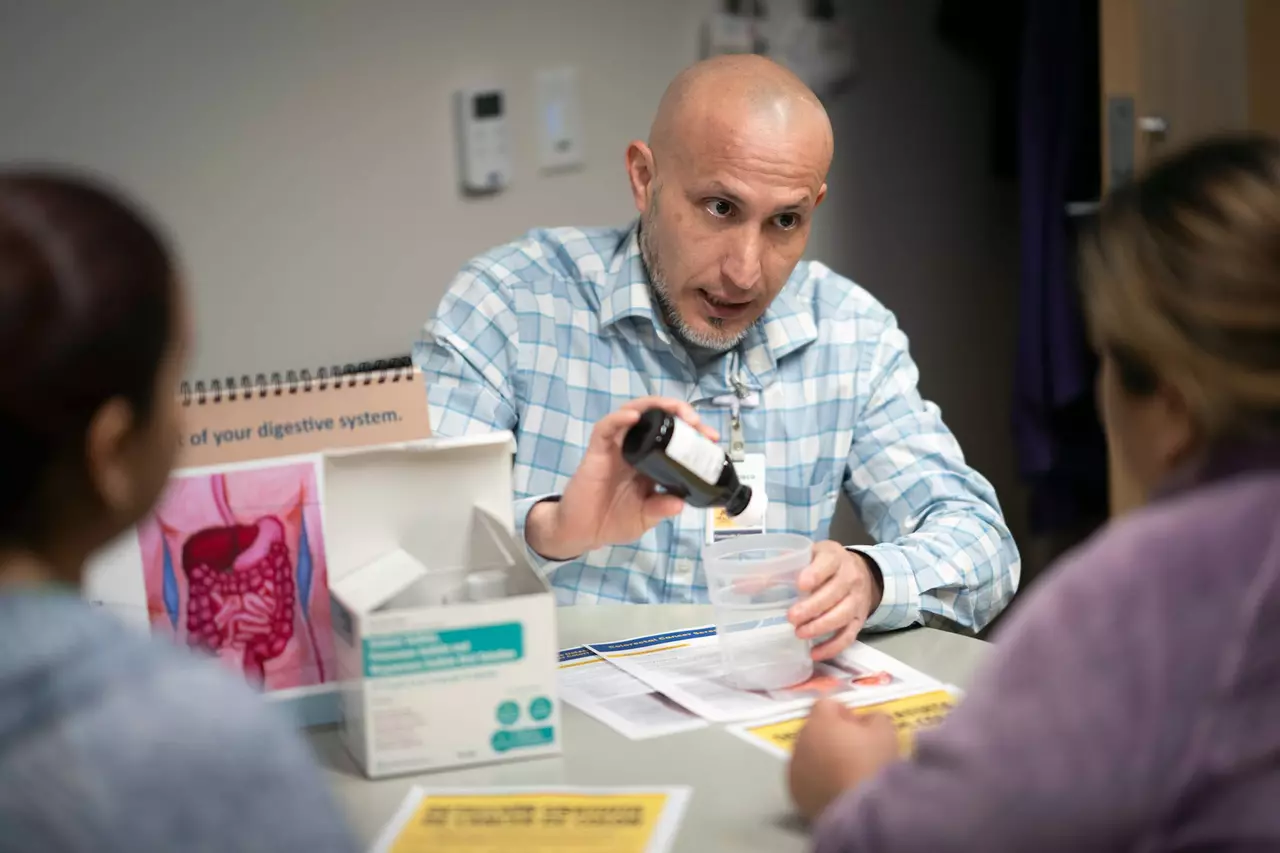 Francisco Ramirez of Fairview Health Services explains the process of a colonoscopy prep to two women at Prince of Peace Church’ s Mission Outpost in Burnsville on March 26.