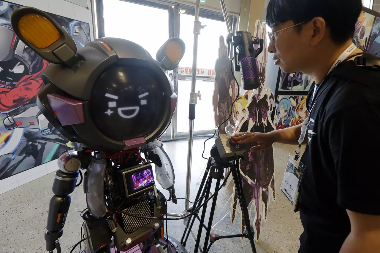 A man communicates with an ASUS Character Virtual Assistant, ROG Omni system during the AI EXPO in Taipei, Taiwan, Wednesday, March 25, 2026. (AP Photo/Chiang Ying-ying)