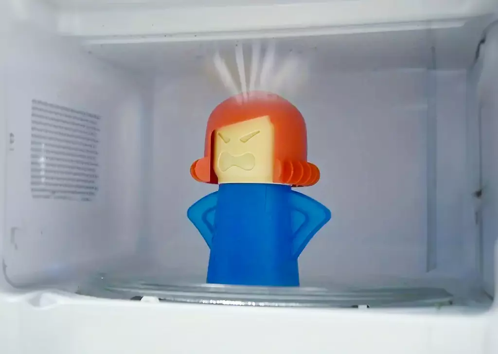 This interesting kitchen utilizes water, vinegar and steam to remove the gunk from the inside of microwaves. It takes less than 5 minutes and a few drops of lemon juice will leave it smelling fresh and clean.
