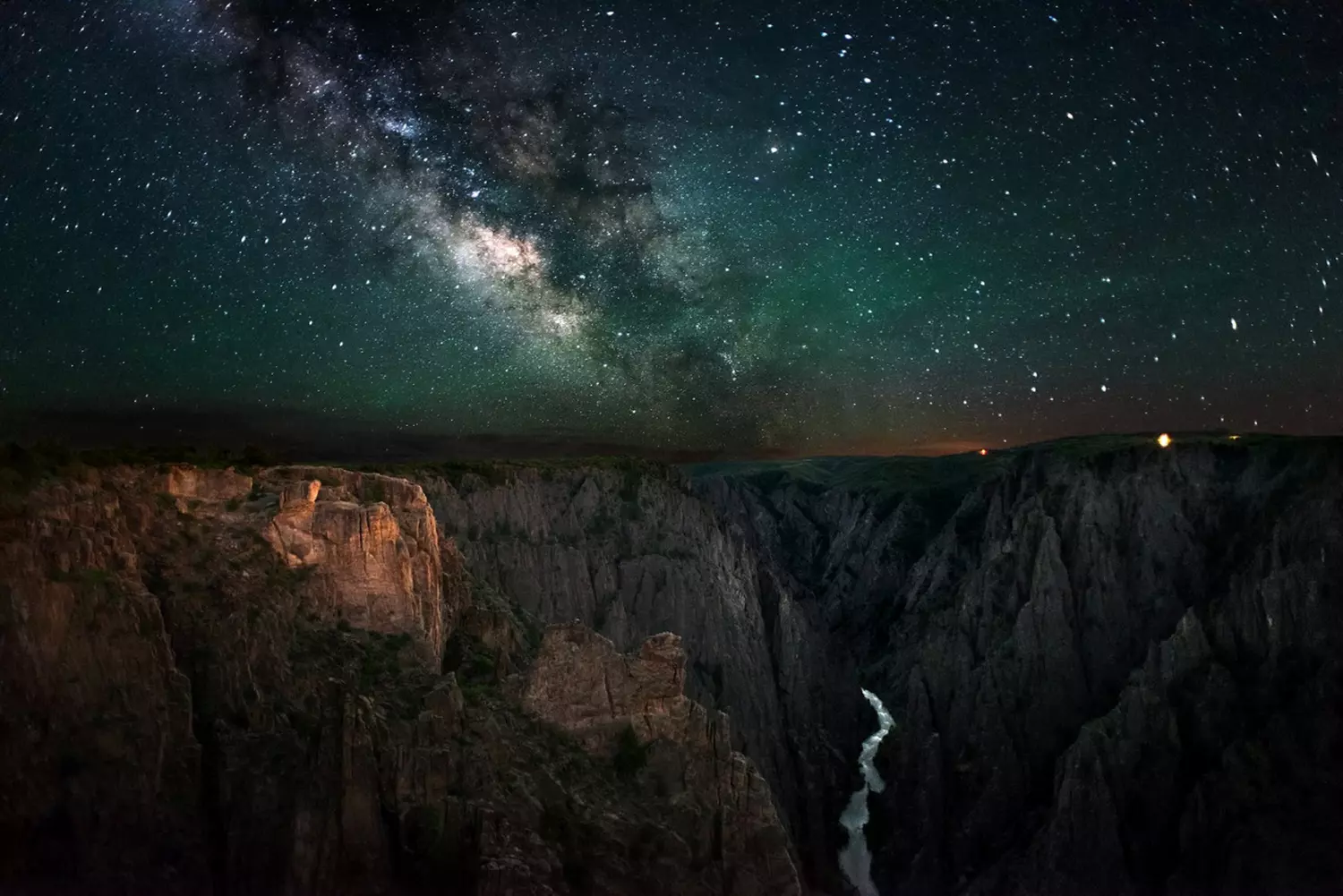 “A star-filled night sky frames this dramatic view of rocky cliffs and gorge at Black Canyon of the Gunnison National Park, Colorado.”