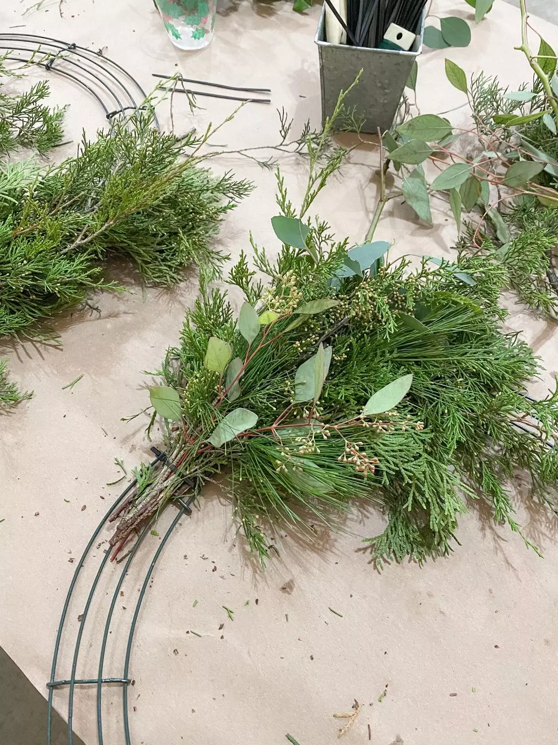 For this wreath, you’ll need a wire frame, zip ties or floral wire, garden clippers and greenery of your choice. Lay your frame flat on a table, gather up a bundle of 4-5 stems of greenery and arrange them attractively. Attach the bundle to the frame, and then repeat the process around the frame. Add other embellishments as desired.