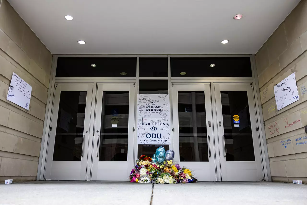 A memorial continues to grow outside of Constant Hall on Old Dominion University’ s campus in Norfolk on Monday, March 16, 2026. On Thursday, March 12, a gunman opened fire on an Army ROTC class killing one person, head of the university’ s Army ROTC Lt. Brandon Shah, and injuring two more.